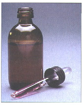 Bottiglia in vetro giallo con pipetta contagocce in plastica inserita nel tappo di chiusura a vite. Confezione indivisibile da 50 pezzi.
