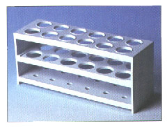 In polipropilene a tre piani. Base stabile e robusta. Resistono a temperature di 135 °C. Fori per provette con diametro massimo di mm 21. Resistenti alla sterilizzazione a vapore (121 °C).