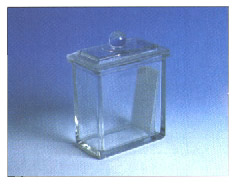 Per piastre TLC mm 100x100. Provvista di un largo bordo stampato a flangia e di un pesante coperchio con pomello che assicura una perfetta tenuta e quindi una condizione ottimale di saturazione della camera.