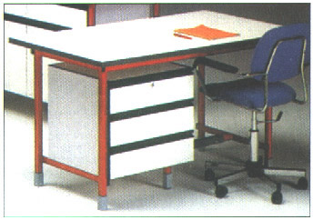 Struttura metallica robusta con verniciatura antiacida, piedini regolabili a pavimento e poggiapiedi rivestito con profilato plastico. Il piano di lavoro è rivestito in laminato plastico melamminico antiriflesso. Le scrivanie sono fornite con cassettiere di cui il primo cassetto è dotato di serratura.