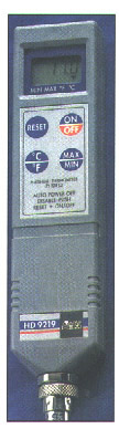 Display LCD a 3½ digit altezza mm 8. Rilevazione temperatura con sensore al platino Pt100. Pulsante Hold per bloccare la lettura, spegnimento automatico dopo 3 minuti. Indicazione di batteria scarica. Alimentazione con batteria 9V IEC 6LF22. Dimensioni strumenti (LxPxA) mm 42x185x23, peso g. 130. Richiedono sonde termometriche serie TP9. Il modello HD 9219 consente anche la misurazione minima/massima. Forniti senza sonda.